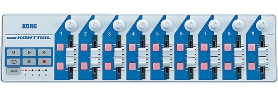 From Korg's series of compact USB controllers that include a keyboard controller, a pad controller, and a studio controller with dedicated transport controls, introducing the: nanoKONTROL which feautures nine faders, nine knobs, 18 switches, plus full transport control.