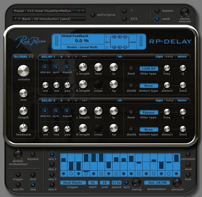 RP Delay: This is not your usual delay plug in, it offer very special features like the Sound Reverser which can trigger reversed sounds via keyboard, 6 delay lines with 8 active multi mode filters can be played all at once. Plus all the basic great sounding mono, stereo , tape sounding delays and much more.
