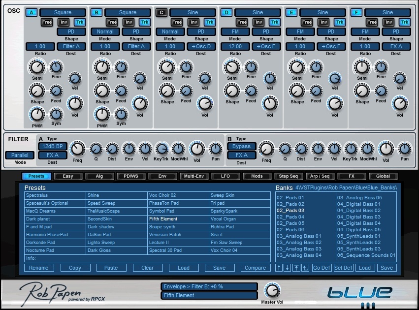 BLUE: This is a great sounding synth that offers FM synthesis, Wave Shaping synthesis, Phase Distortion Synthesis and Subtractive Synthesis.