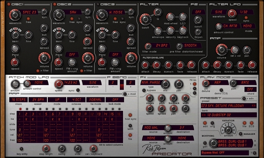 Predator: The Predator is an awesome sounding “Phat” synthesizer with a simple to use interface, great sounding effects, an arpeggiator and a 16 step sequencer.