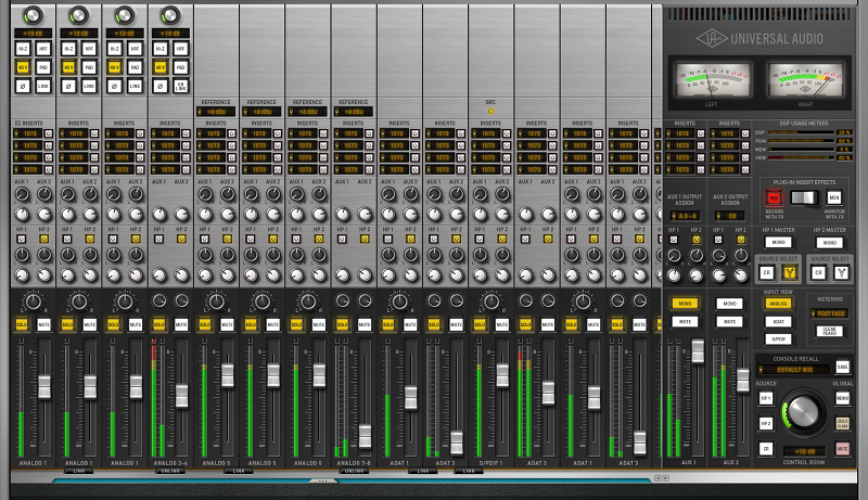 The Apollo has a total of 8 analog inputs: 4 digitally controlled premium analog mic preamps, 8 balanced line inputs and 2 front mounted JFET Direct Inputs.