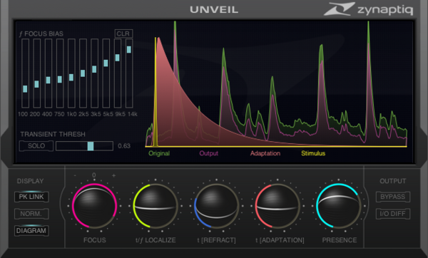 UNVEIL’s algorithm isn’t limited to processing reverb. Actually, it processes any signal components that the human auditory system considers as being of little significance, which includes the parts that many engineers refer to as “mud”. As a result, UNVEIL allows reducing the level of all the stuff that clouds your signal and masks the detail you work so hard to capture, bringing the key features into focus and, well, unveiling all the inherent detail. As a bonus, this also increases headroom, so you’ll even be able to increase perceived levels without having to slam the meters. And again, you can use the inverse function to add grit and a less up-front character to your recording.